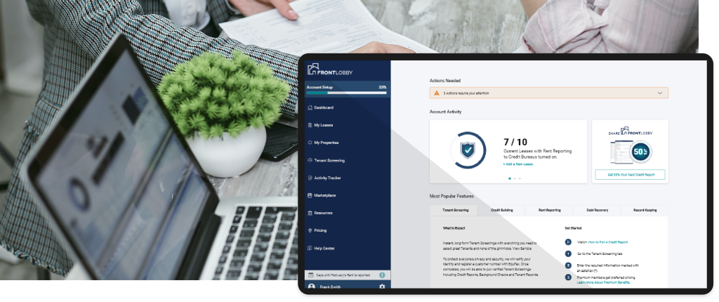 With FrontLobby, you can improve your relationship with your tenants and reduce the stress that comes with being a housing provider. Utilizing their debt reporting feature, you can more reliably recover the debt you may have from former leases. With tenant screening, you can perform instant tenant credit checks at an affordable price. With rent reporting, you can reward your great tenants and incentivize those with unpaid debts with credit bureau reporting. You’ll stay organized with useful tools like record-keeping, automated tenant communications, and relevant application and lease clauses. In short, FrontLobby helps housing providers spend more time on their investments and less time chasing delinquencies.